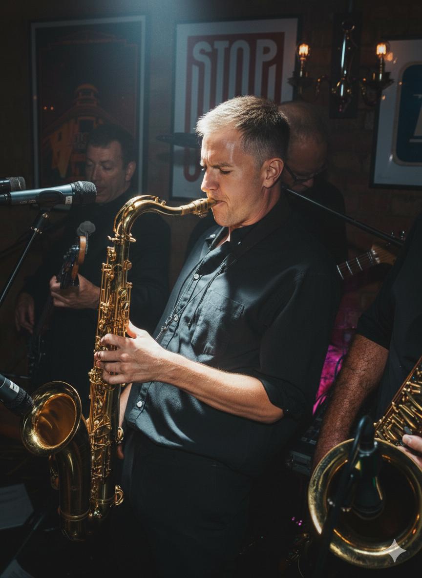 Leon sings and plays tenor sax